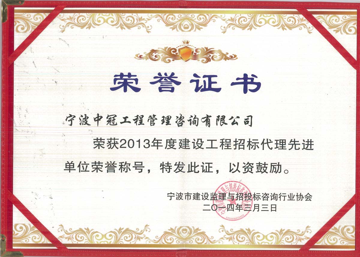 2013年度建設(shè)工程招標(biāo)代理先進(jìn)單位榮譽(yù)稱號(hào)-中冠榮譽(yù)-中冠咨詢-中冠工程管理咨詢有限公司
