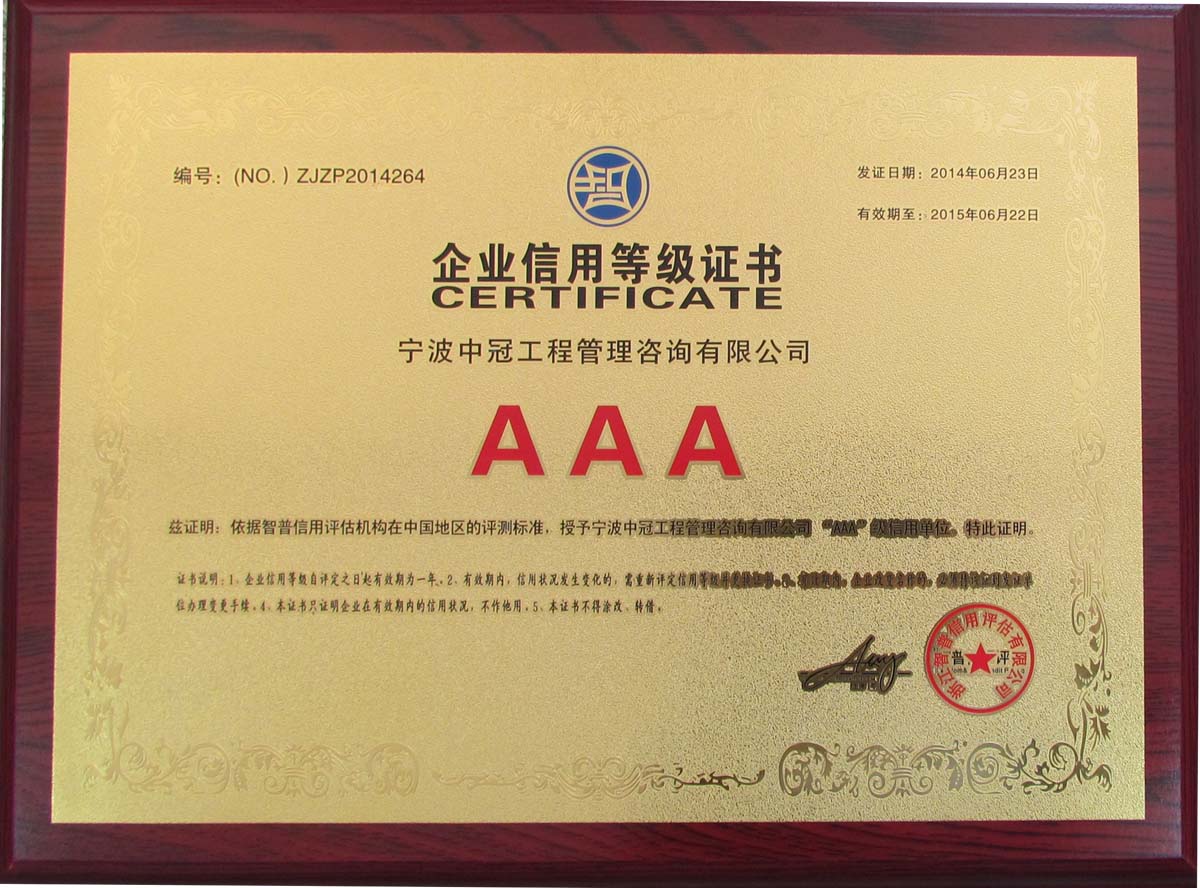 企業(yè)信用等級(jí)證書AAA-中冠榮譽(yù)-中冠咨詢-中冠工程管理咨詢有限公司