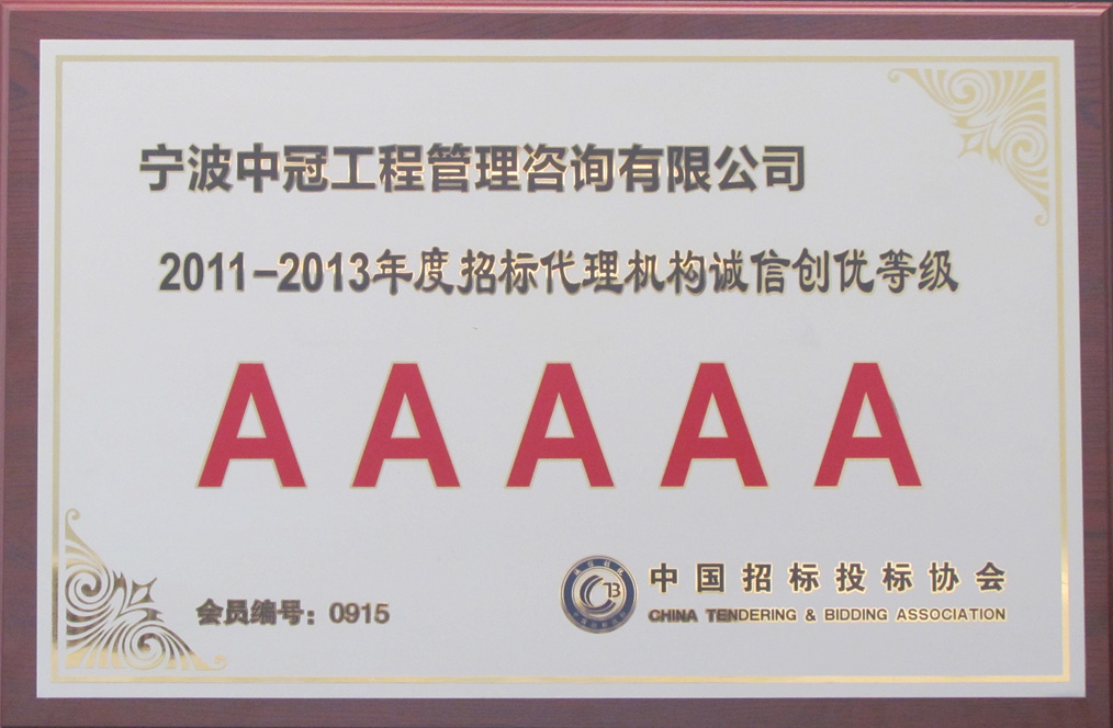 2011-2013年度招標(biāo)代理機(jī)構(gòu)誠信創(chuàng)優(yōu)等級證書5A