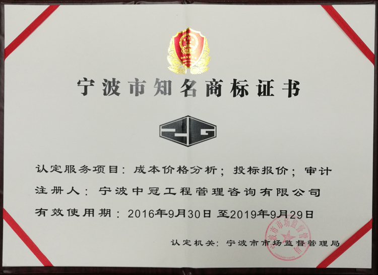 寧波市知名商標(本)-中冠榮譽-中冠咨詢-中冠工程管理咨詢有限公司