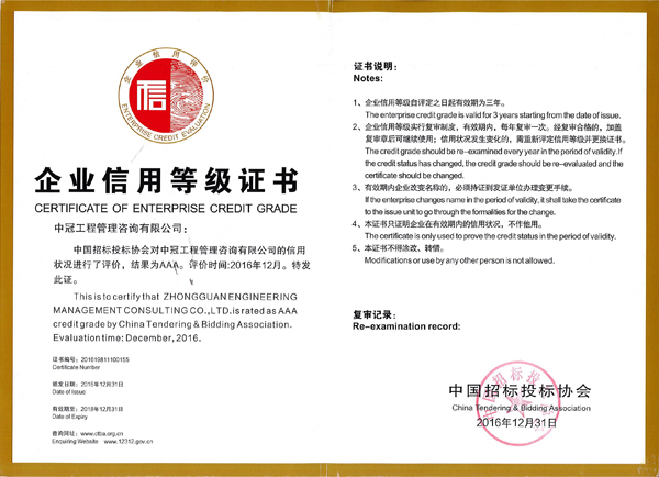 “中國招標(biāo)投標(biāo)協(xié)會企業(yè)信用評價(jià)AAA級信用企業(yè)”榮譽(yù)稱號-中冠榮譽(yù)-中冠咨詢-中冠工程管理咨詢有限公司