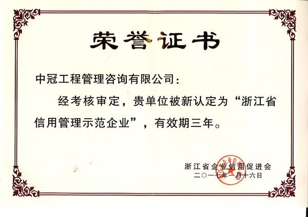 “浙江省信用管理示范企業(yè)”榮譽(yù)稱號-中冠榮譽(yù)-中冠咨詢-中冠工程管理咨詢有限公司