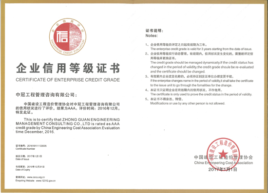 “中國建設(shè)工程造價管理協(xié)會企業(yè)信用評價AAA級信用企業(yè)”榮譽稱號-中冠榮譽-中冠咨詢-中冠工程管理咨詢有限公司