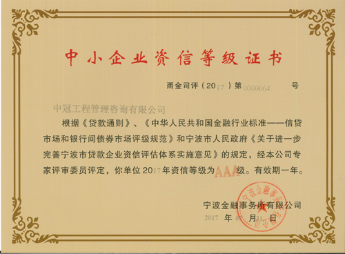 “2017年度中小企業(yè)資信等級AAA級”榮譽稱號-中冠榮譽-中冠咨詢-中冠工程管理咨詢有限公司