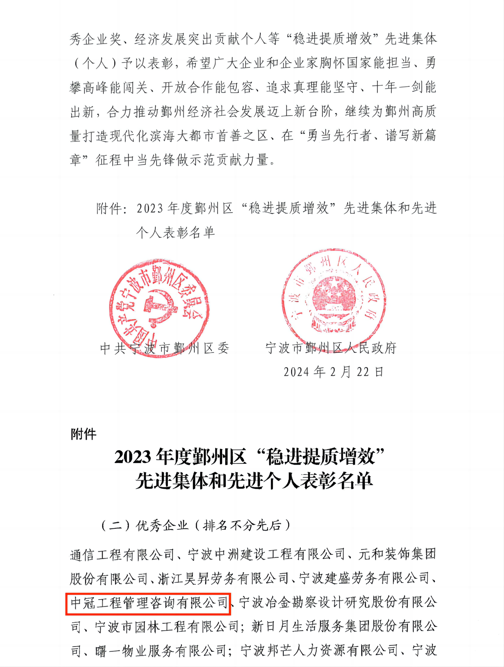 中冠喜報(bào) | 我司獲評(píng)2023年度鄞州區(qū)“穩(wěn)進(jìn)提質(zhì)增效”先進(jìn)集體-優(yōu)秀企業(yè)-中冠新聞-中冠咨詢-中冠工程管理咨詢有限公司