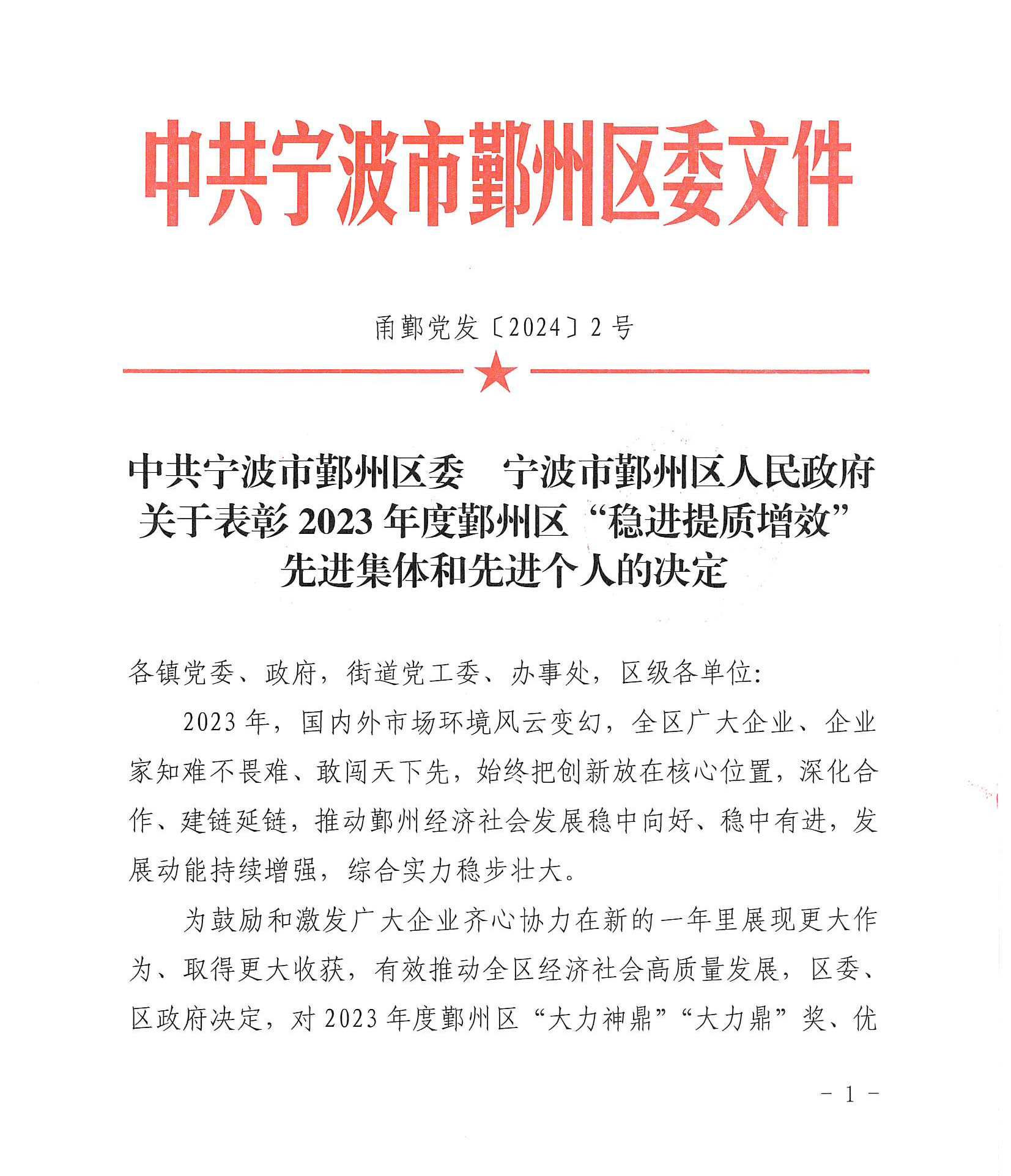 中冠喜報(bào) | 我司獲評(píng)2023年度鄞州區(qū)“穩(wěn)進(jìn)提質(zhì)增效”先進(jìn)集體-優(yōu)秀企業(yè)