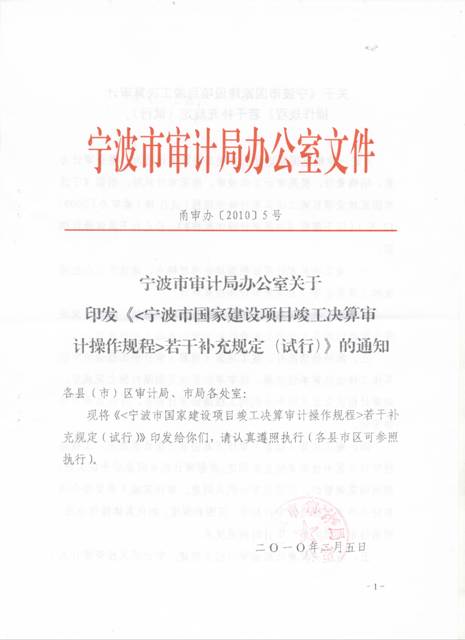 寧波市審計局辦公室關(guān)于印發(fā)《<寧波市國家建設(shè)項目竣工決算審計操作規(guī)程>若干補充規(guī)定(試行)》的通知